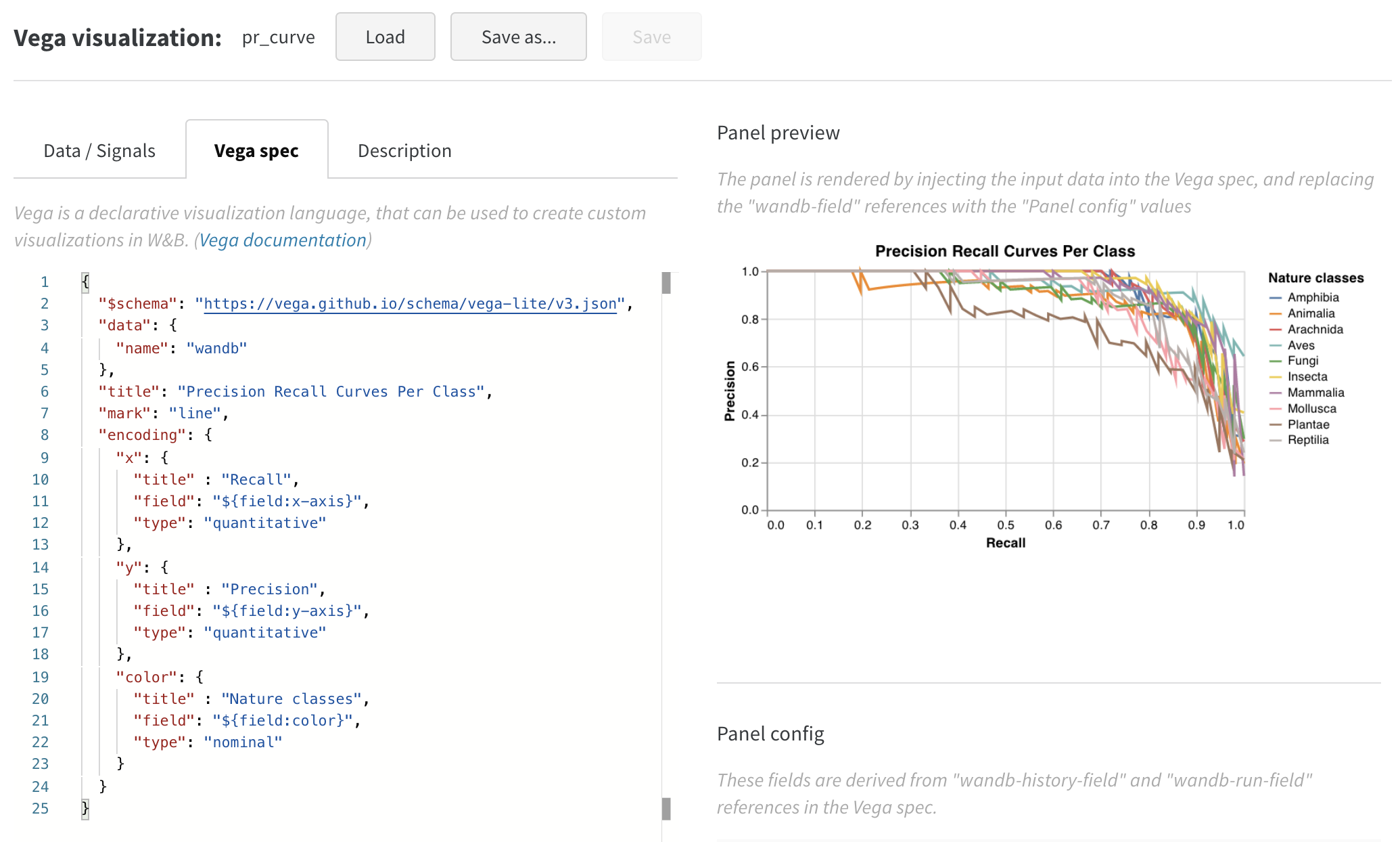 - プレビューで見えるプロットに満足するまで、Vega スペックとクエリを継続的に変更できます。完了したら、上部の「Save as」をクリックしてカスタムプロットに名前を付け、再利用できるようにします。その後、「Apply from panel library」をクリックしてプロットを完成させます。