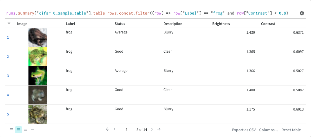Suppose you want to query a W&B Table. In your training code you log a table called "cifar10_sample_table":