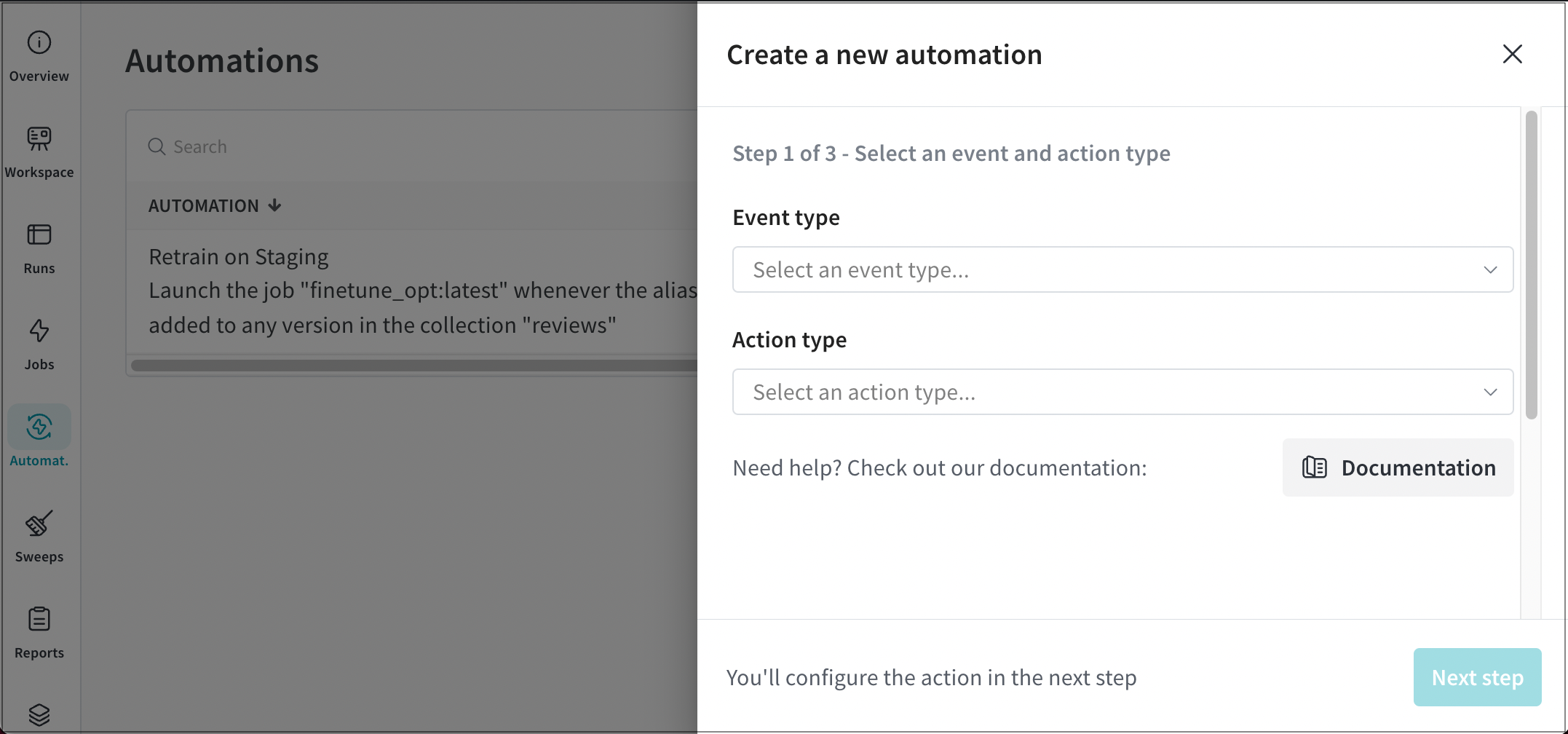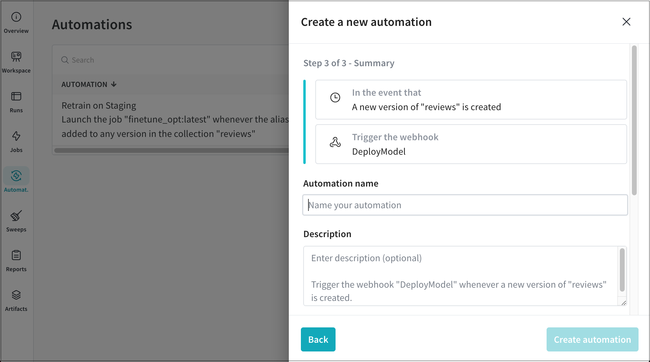 これはW&Bモデルレジストリで作成されたオートメーションとは対照的です。モデルレジストリで作成されたオートメーションはモデルレジストリのスコープにあり、モデルレジストリにリンクされたモデルバージョンに対してイベントが実行されたときにトリガーされます。モデルバージョンのオートメーションの作成方法については、モデルCI/CDのオートメーションページを参照してください。