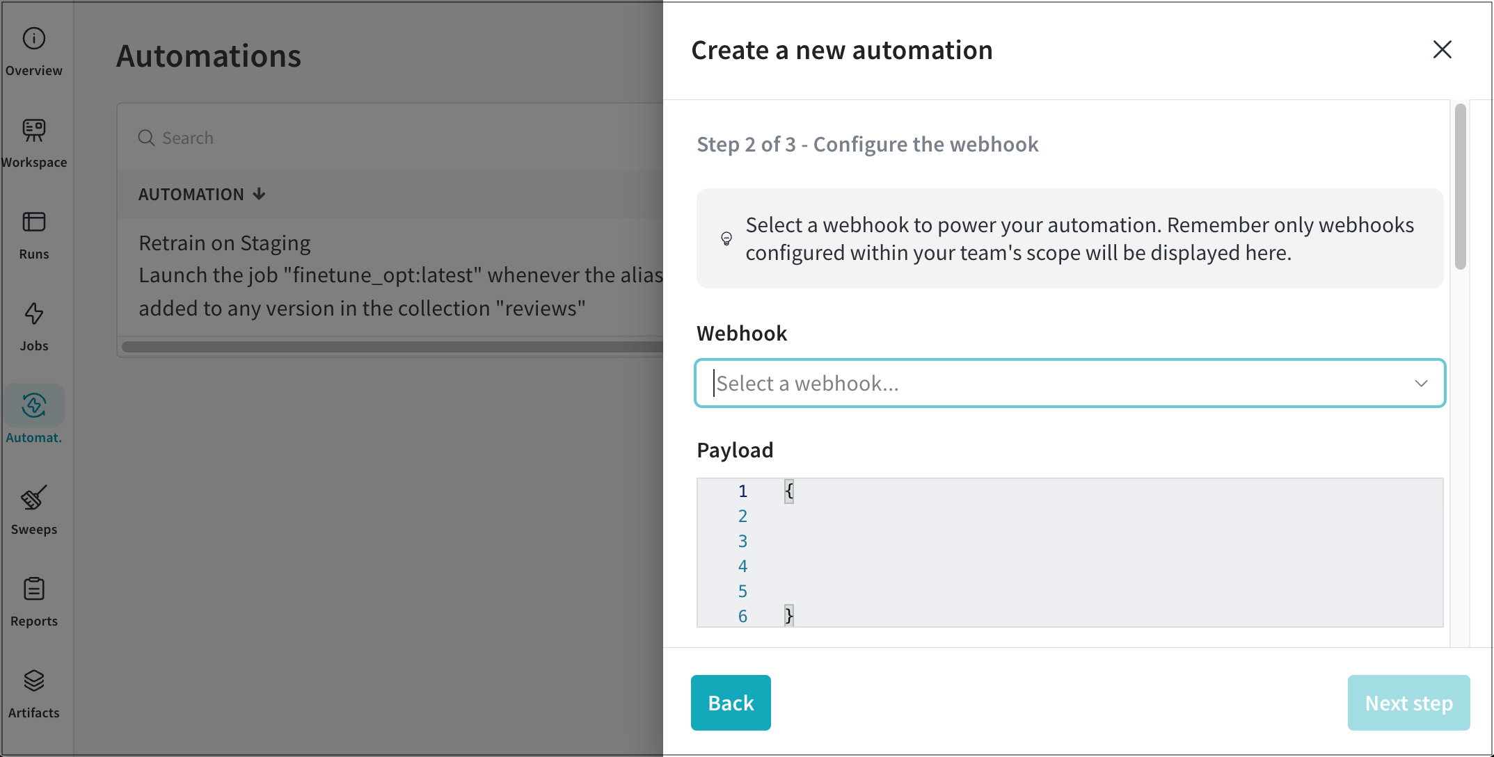 W&B App UIを使用してアクションに基づいたWebhookを自動化します。これを行うには、まずWebhookを確立し、次にWebhookオートメーションを設定します。