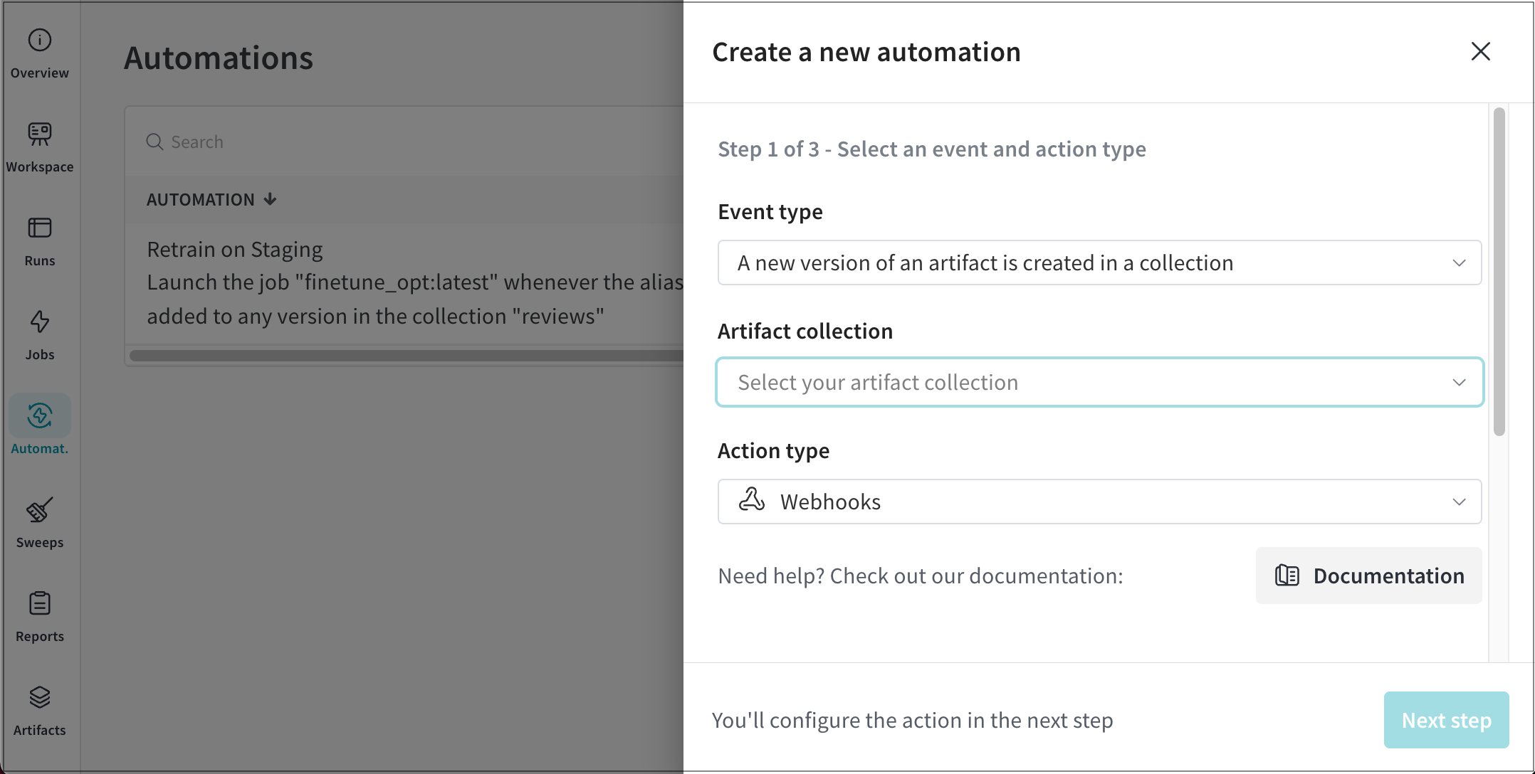 アクションはトリガーの結果として発生する応答的な変異です(内部または外部)。プロジェクト内のアーティファクトコレクションでイベントに応じて作成できるアクションには、WebhooksとW&B Launch Jobsの2つのタイプがあります。