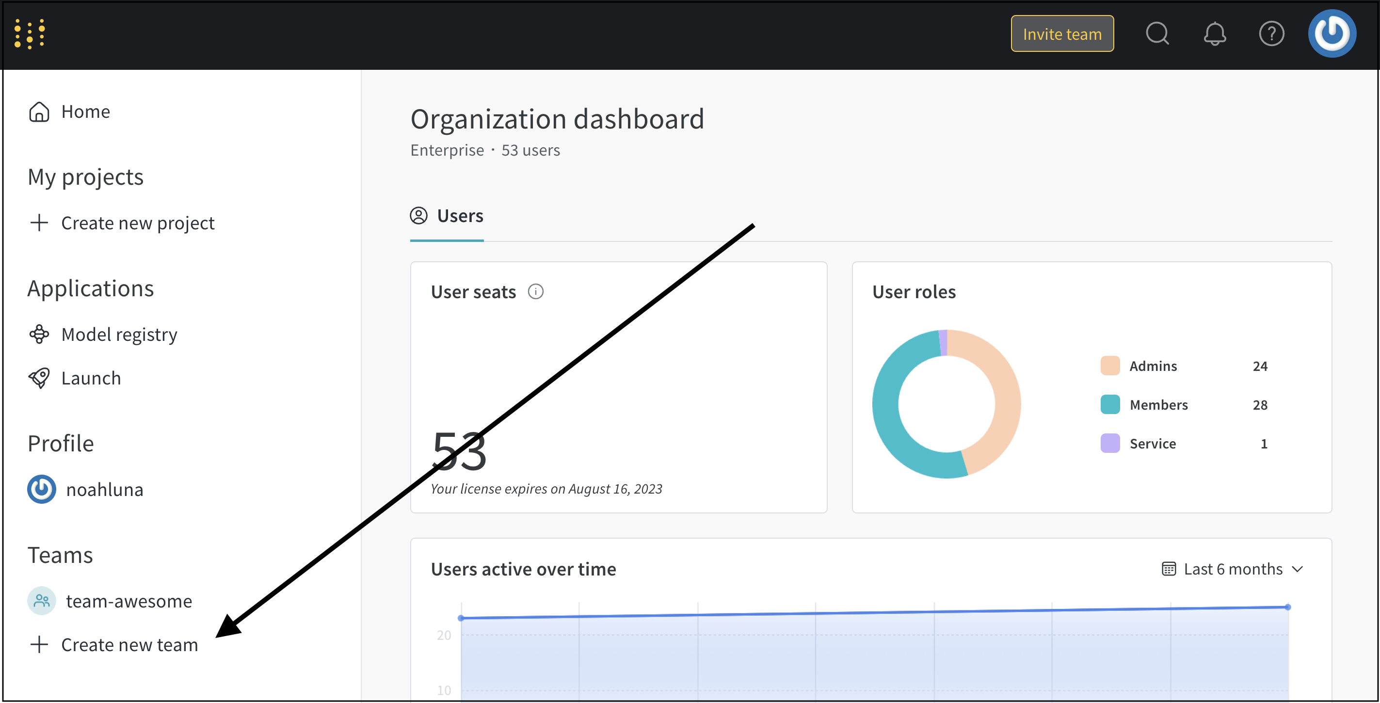 インスタンス管理者として、ユーザーの招待、削除、およびロールの変更ができます。そのためには、Organizationダッシュボードに移動し、以下の指示に従います。
