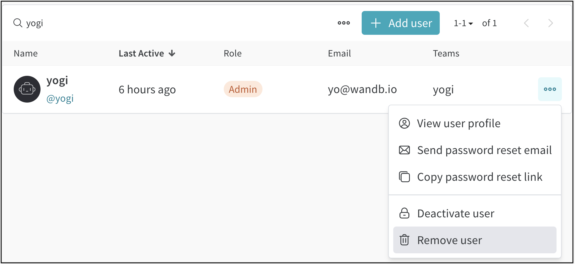 ライセンスに席が残っていない場合、Add userオプションが使用できないことがあります。ユーザーの追加に問題がある場合は、W&Bチームに連絡してください。