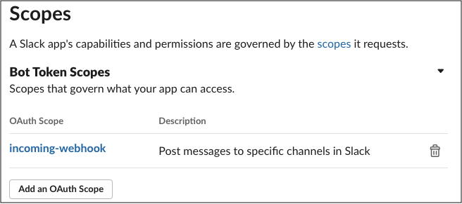 Scopes セクション内で、bot に incoming_webhook スコープを付与します。スコープは、開発ワークスペースでアプリケーションがアクションを実行する許可を与えます。