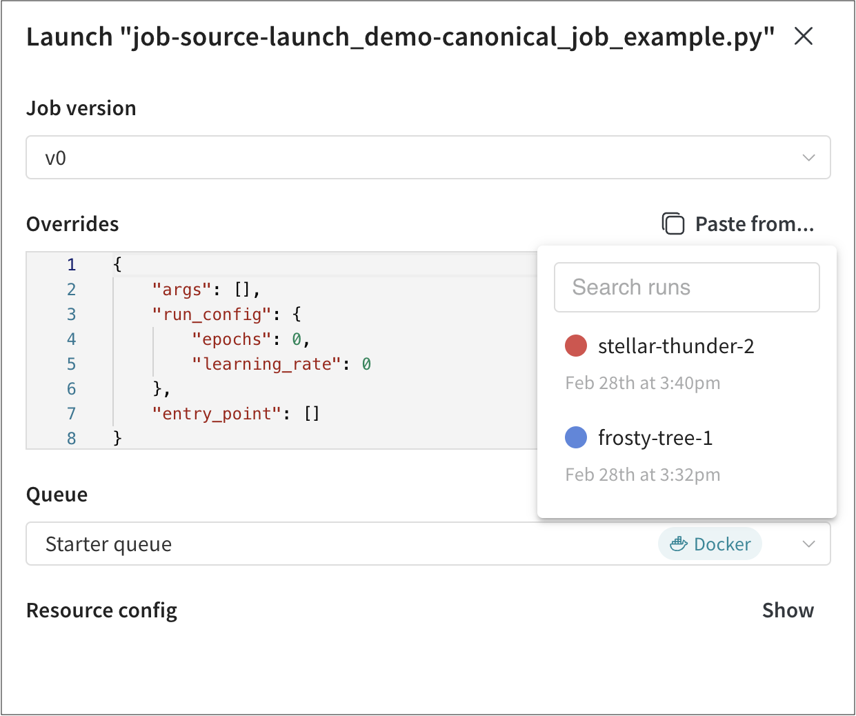 6. Overridesセクションで、launch jobに設定されている入力値の新しい値を提供します。共通のオーバーライドには、新しいエントリーポイントコマンド、引数、または新しいW&B runのwandb.configの値が含まれます。 Paste from...ボタンをクリックすることで、他のW&B runsから使用されたlaunch jobの値をコピー&ペーストできます。