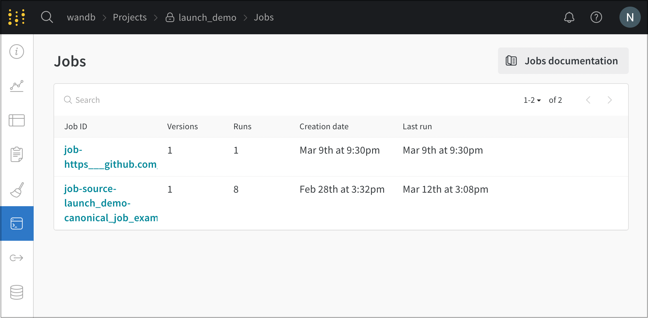3. Jobsページには、以前に実行されたW&B runsから作成されたW&B launch jobsのリストが表示されます。