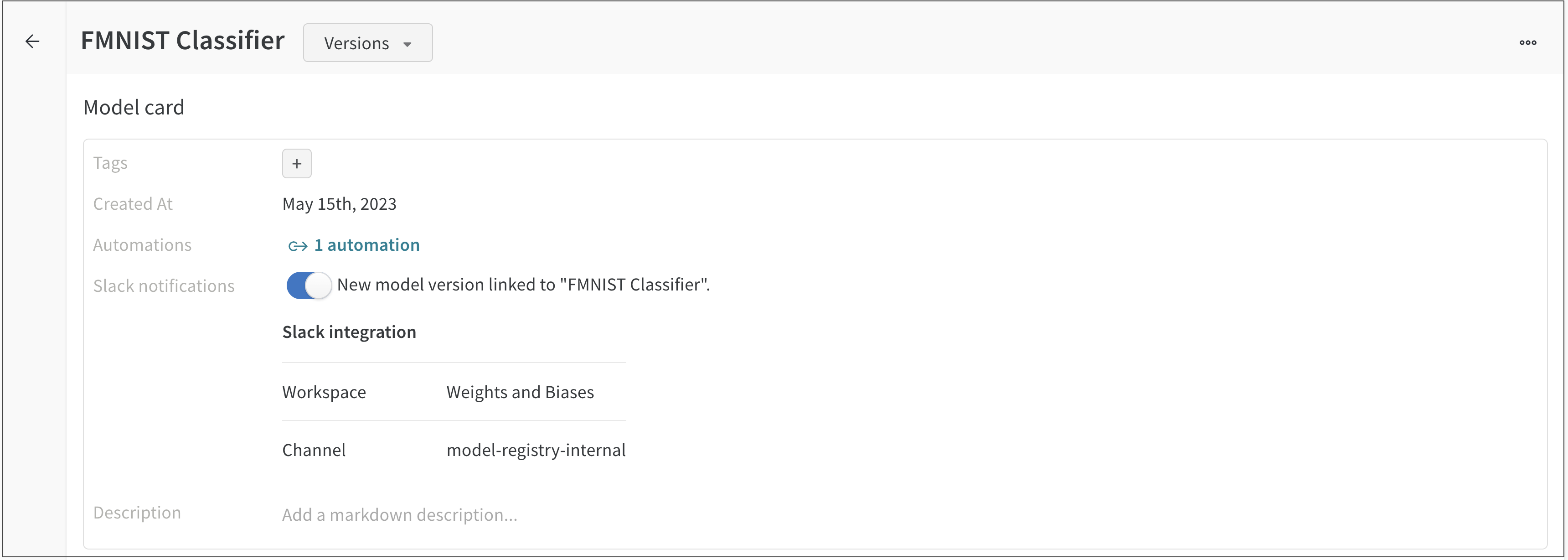 以下のスクリーンショットは、Slack 通知が設定されている FMNIST 分類器の登録済みモデルを示しています。