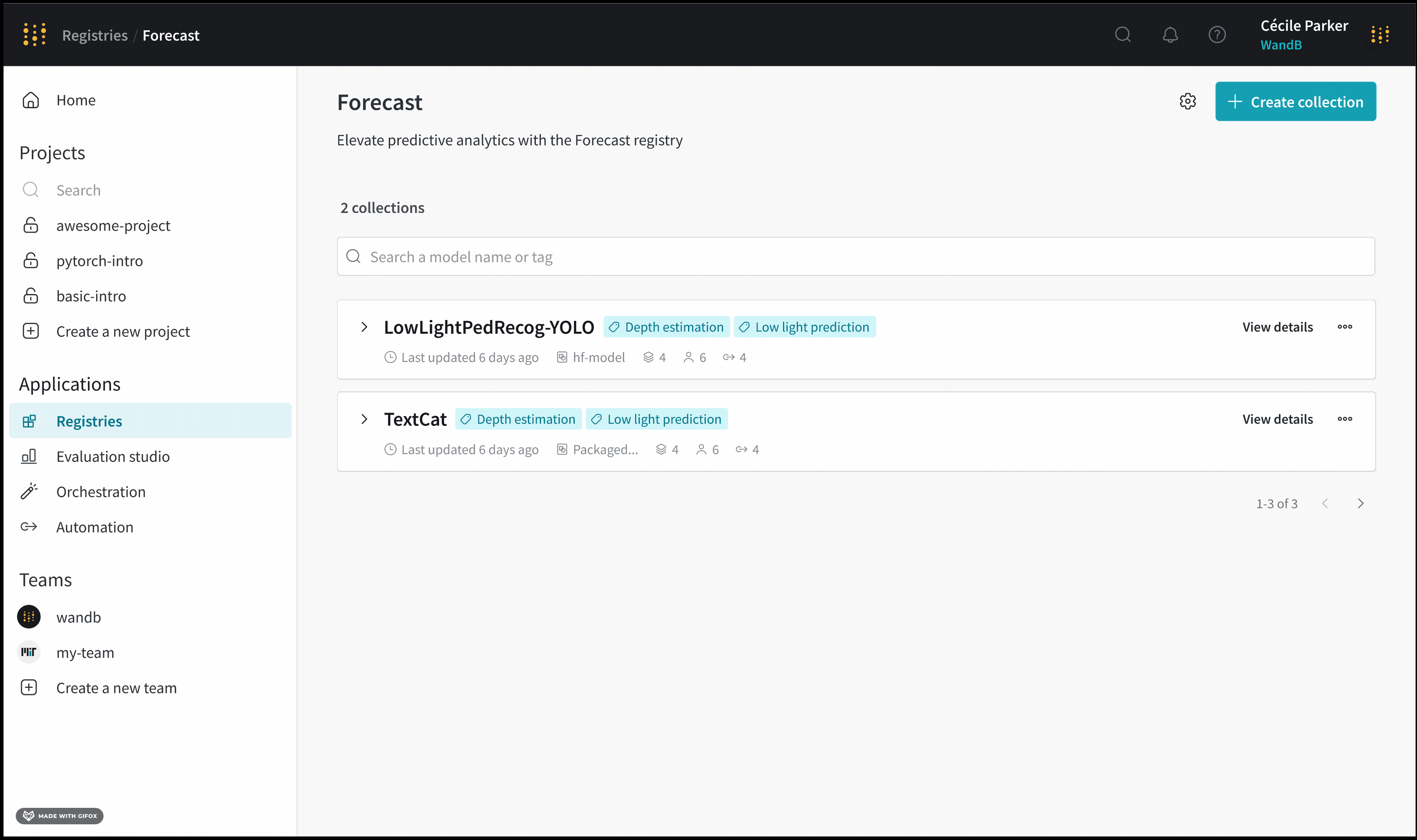 例えば、上の画像は「Forecast」という名前のレジストリを示しています。「Forecast」レジストリ内には、「LowLightPedRecog-YOLO」と「TextCat」という2つのコレクションがあります。