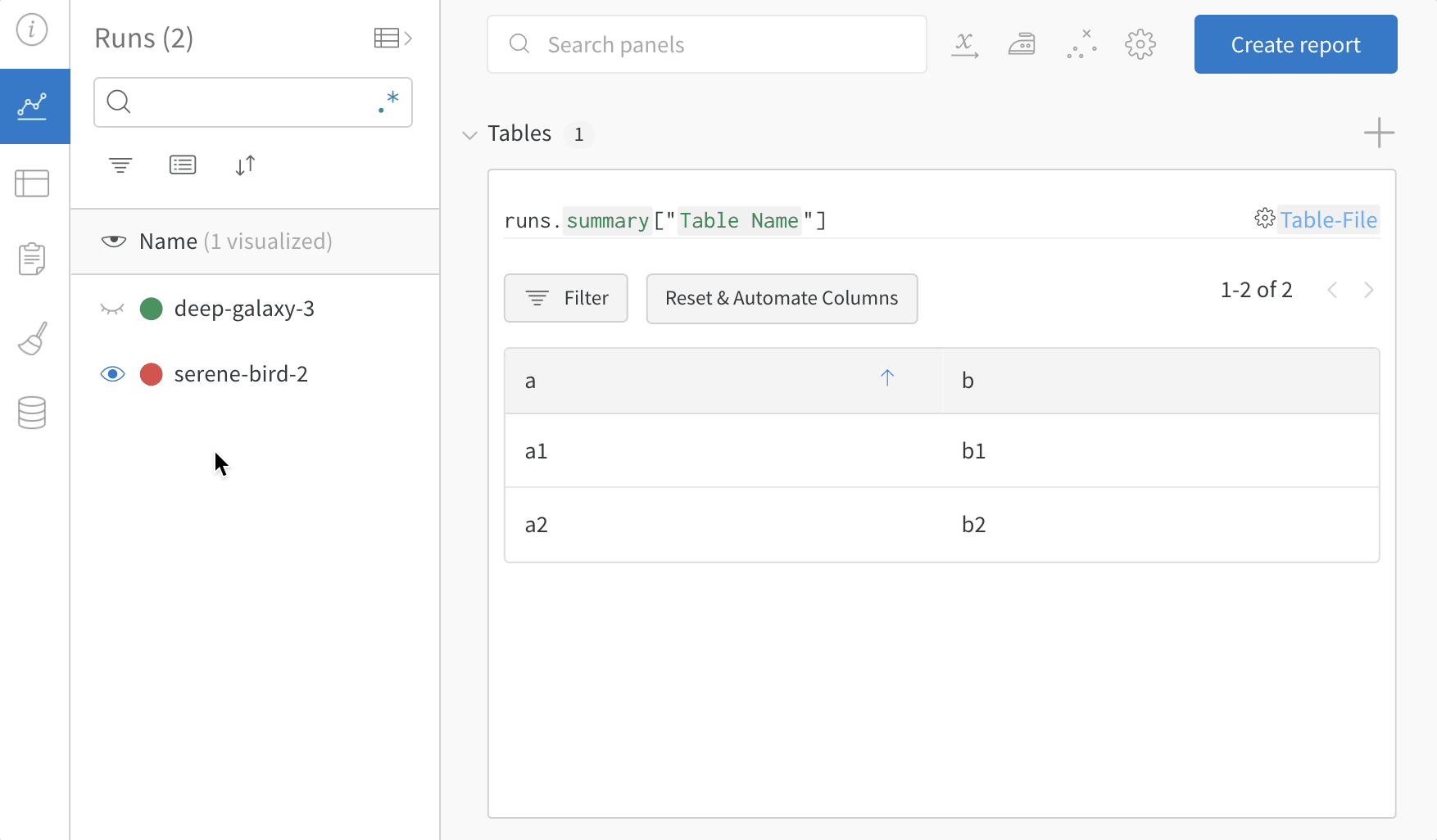 my_table = wandb.Table(columns=["a", "b"], data=[["a1", "b1"], ["a2", "b2"]])