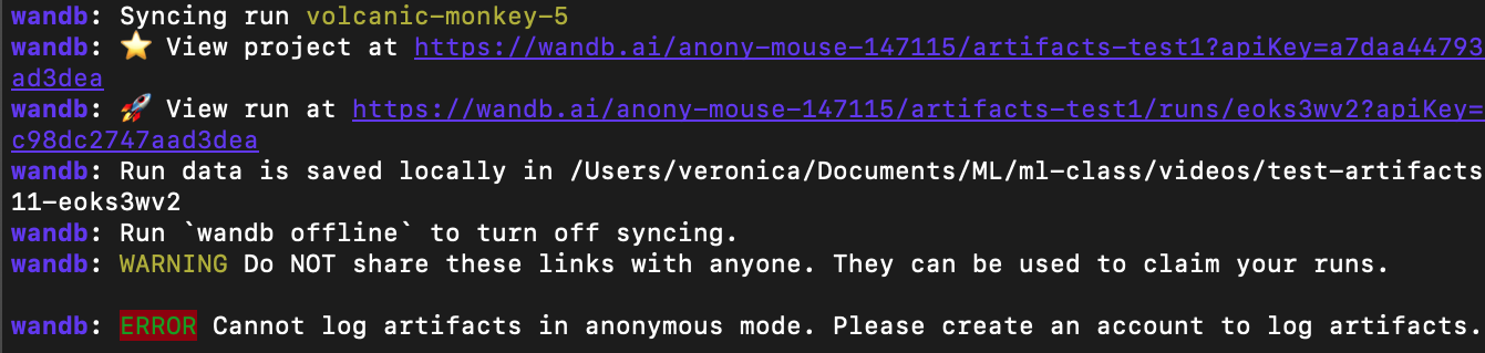 • 아티팩트 로깅 불가: 실행은 커맨드라인에 아티팩트를 익명 실행에 로그할 수 없다는 경고를 출력합니다.