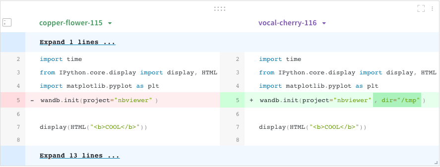 워크스페이스나 리포트에 새 패널을 추가하려면 + 버튼을 클릭하고 코드 비교기를 선택하세요. 프로젝트 내의 두 실험을 비교하고 코드가 정확히 어떻게 변경되었는지 확인하세요. 예시는 다음과 같습니다: