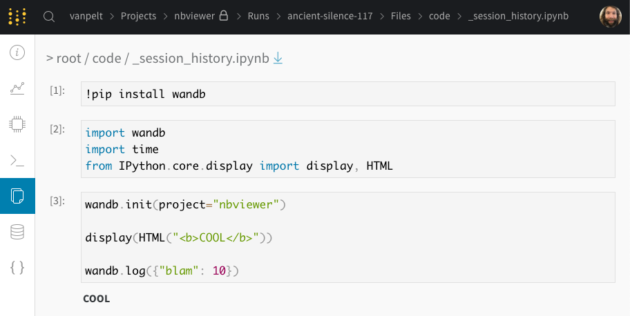이 파일을 클릭하면 세션에서 실행된 셀과 iPython의 디스플레이 메소드를 호출하여 생성된 출력물이 표시됩니다. 이를 통해 주피터 내에서 특정 run에서 실행된 코드가 정확히 무엇인지 확인할 수 있습니다. 가능한 경우 코드 디렉토리에서 가장 최근 버전의 노트북도 저장합니다.