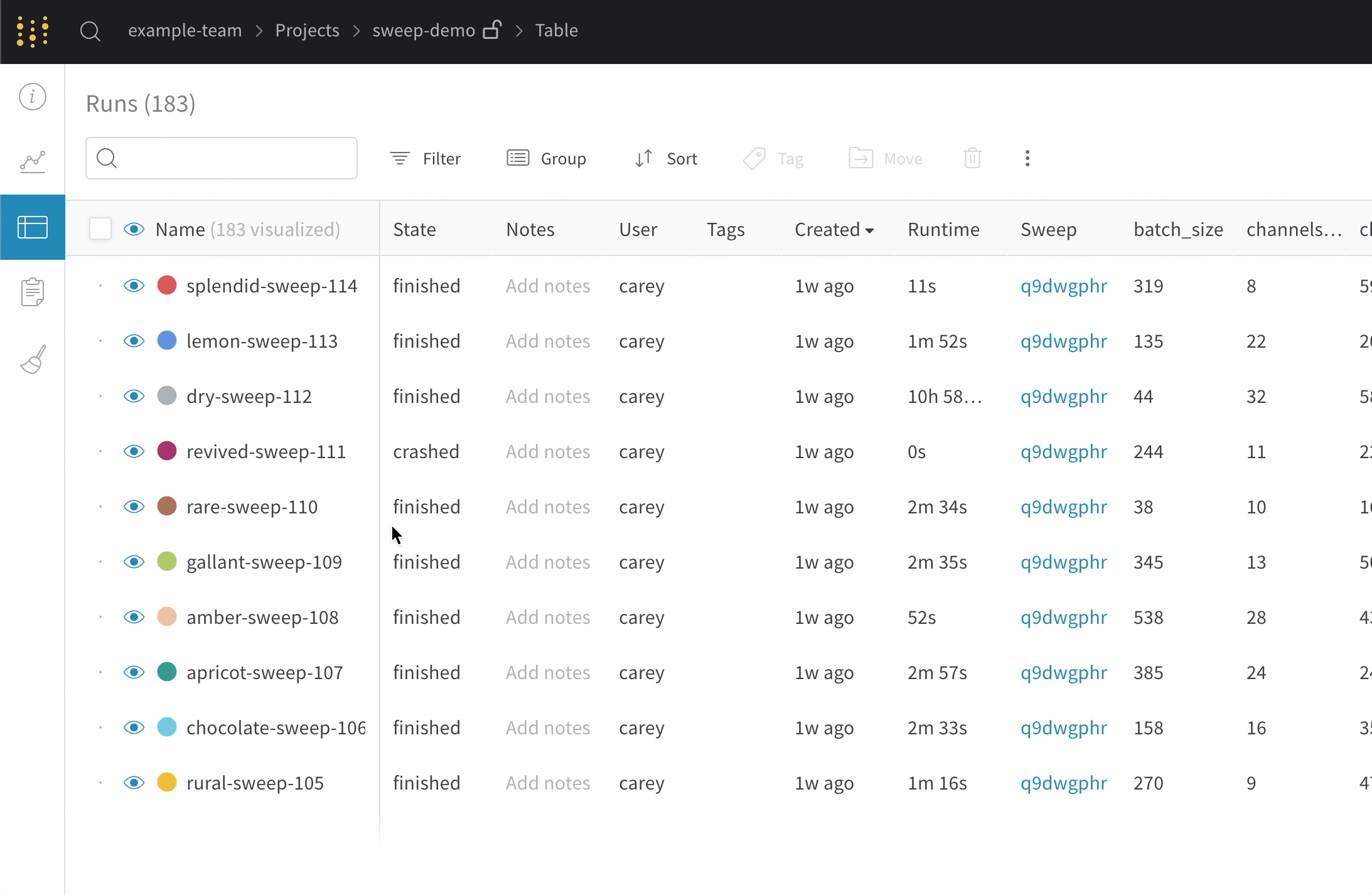 로그된 메트릭의 최소 또는 최대 값에 따라 run 표를 정렬합니다. 이는 기록된 최고(또는 최악)의 값을 보고 싶을 때 특히 유용합니다.
