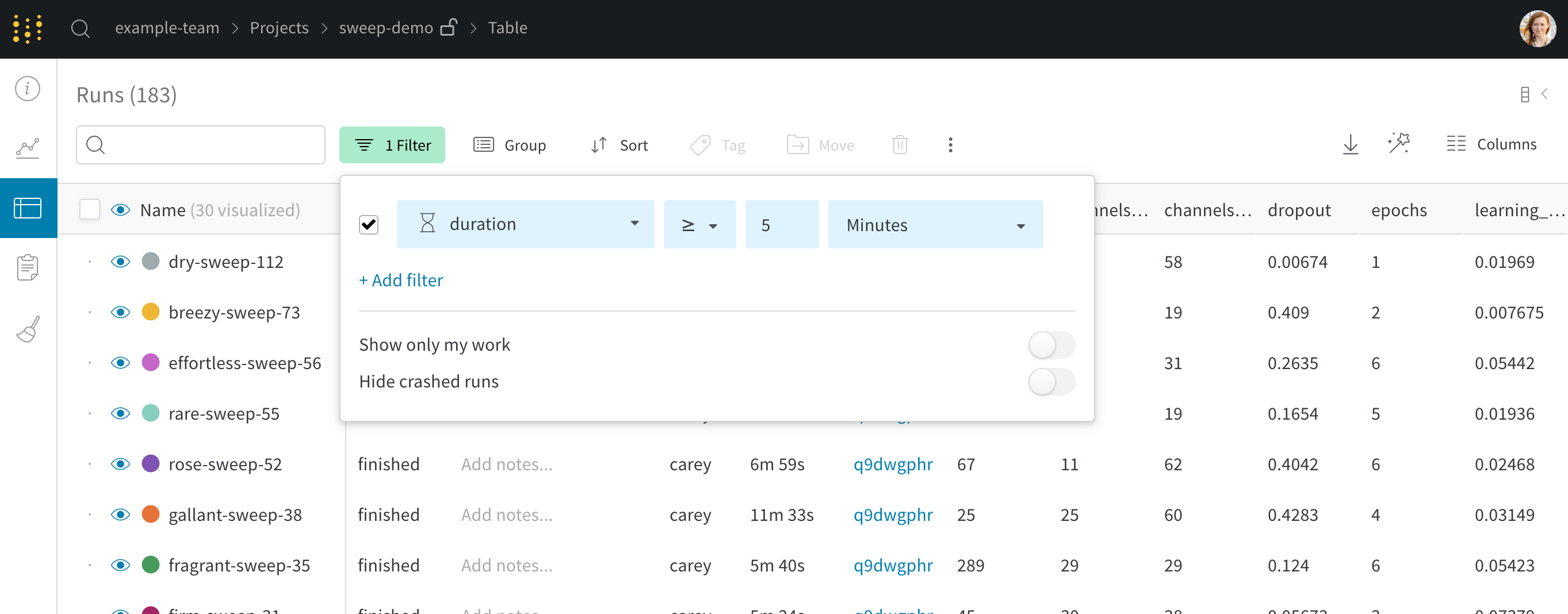 - Duration: 새 필터를 추가하고 "duration"을 선택하여 짧은 run을 숨깁니다