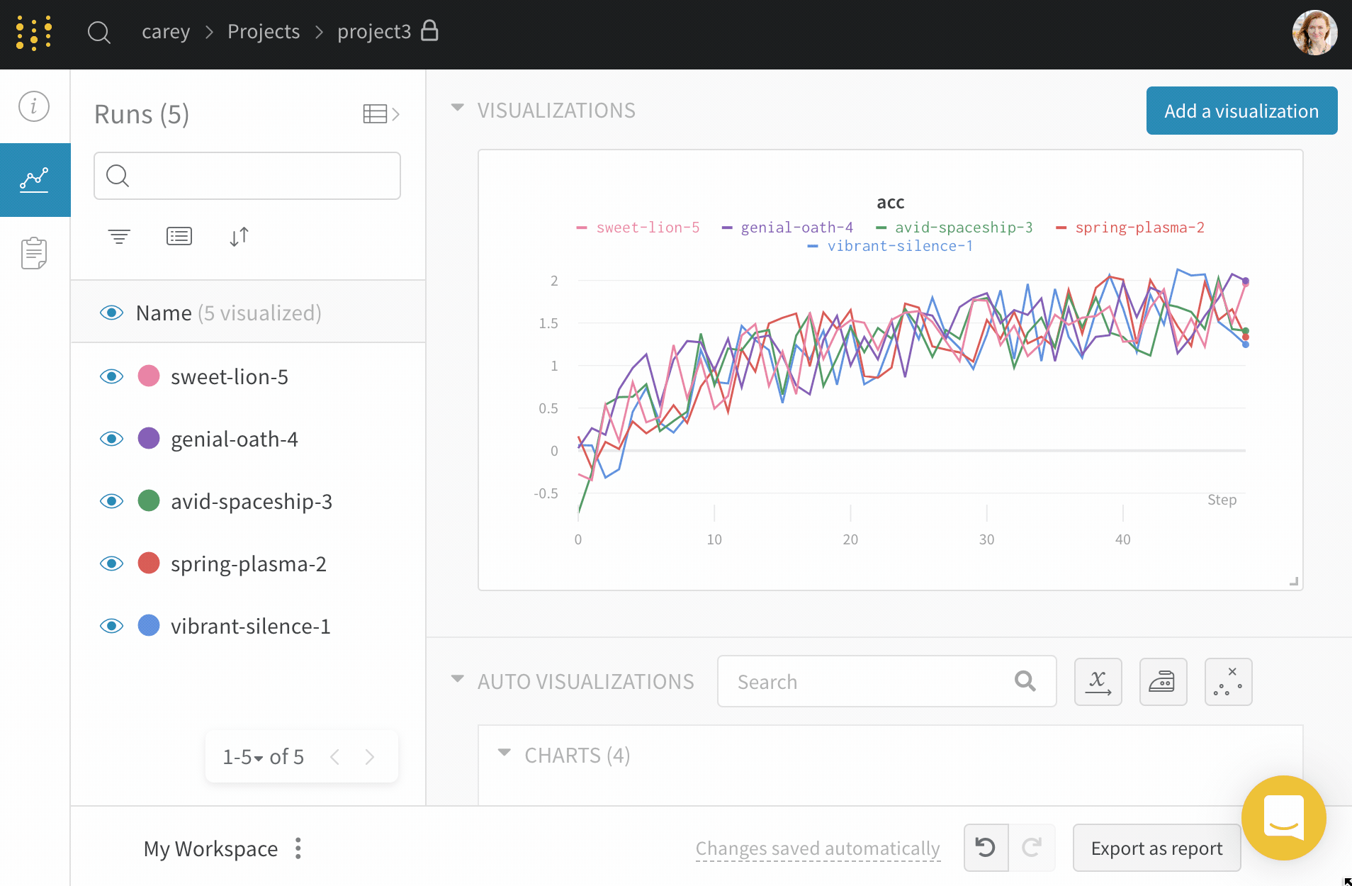 프로젝트 페이지에서 우리는 사이드바에서 run을 보여줍니다. 사이드바를 확장하여 표에서 run들의 하이퍼파라미터와 요약 메트릭을 확인하세요.