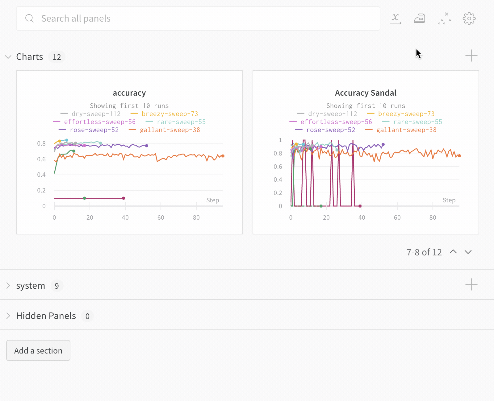 패널 레이아웃: 이 스크래치 공간을 사용하여 결과를 탐색하고, 차트를 추가 및 제거하며, 다른 메트릭을 기반으로 모델의 버전을 비교하세요