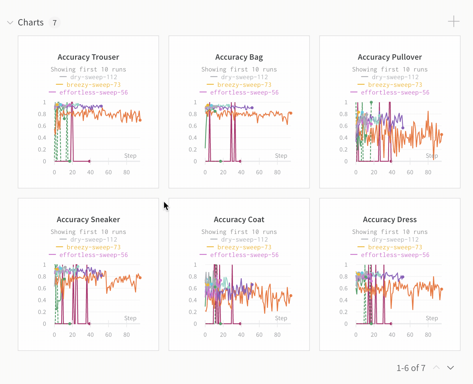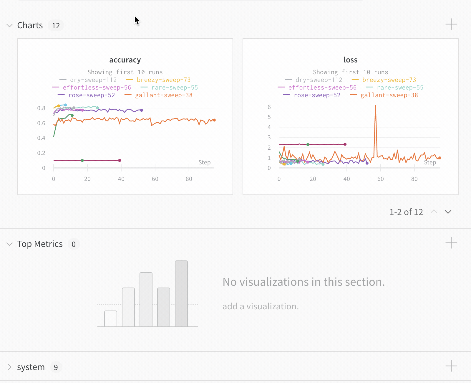 • 정렬: 예를 들어 가장 낮은 손실이나 가장 높은 정확도를 가진 run에 의해 run을 정렬할 값을 선택하세요. 정렬은 그래프에 나타나는 run에 영향을 미칩니다.
