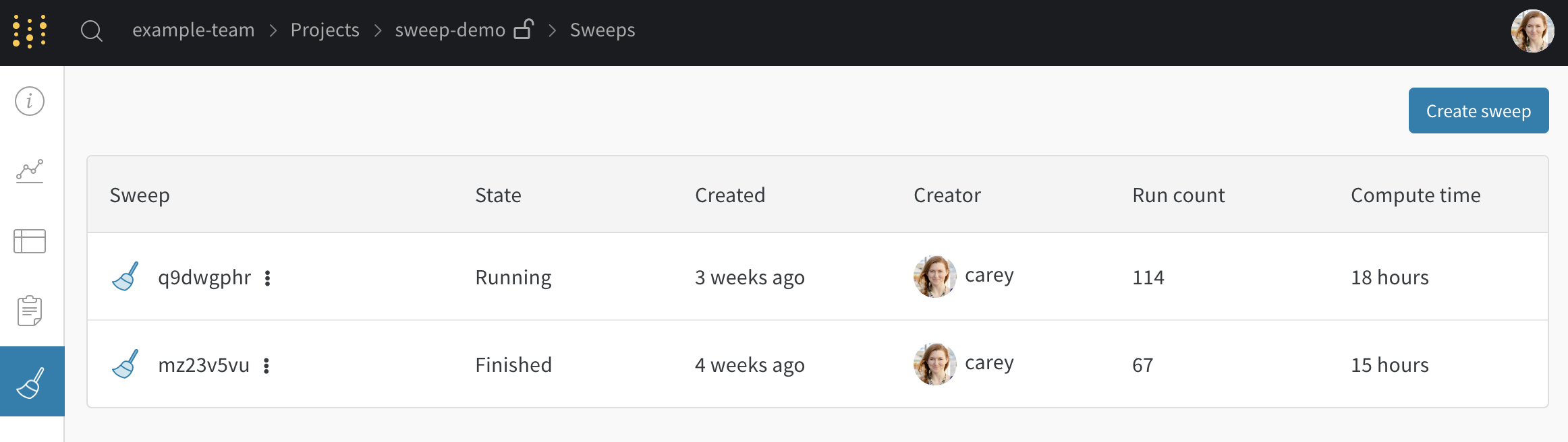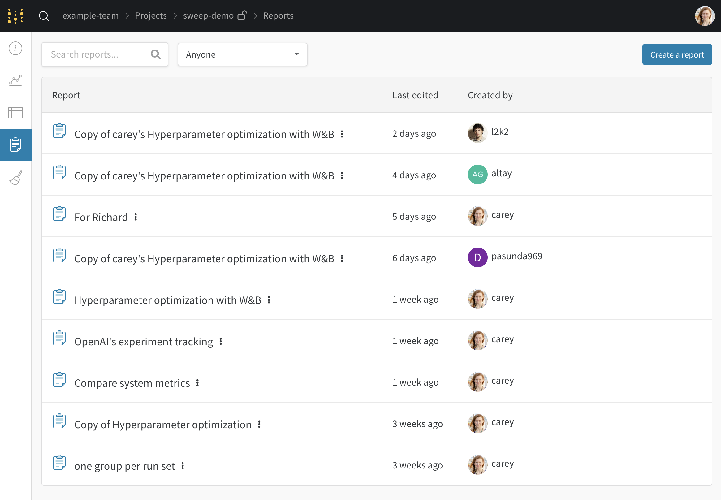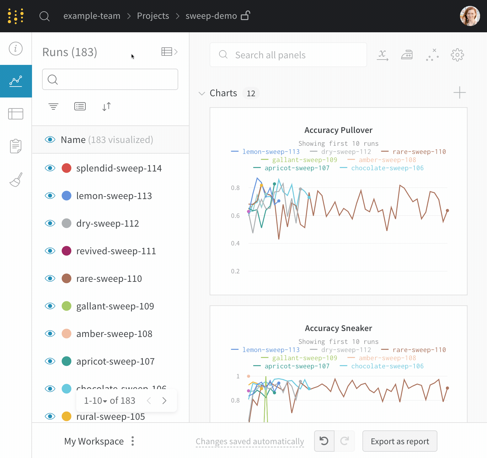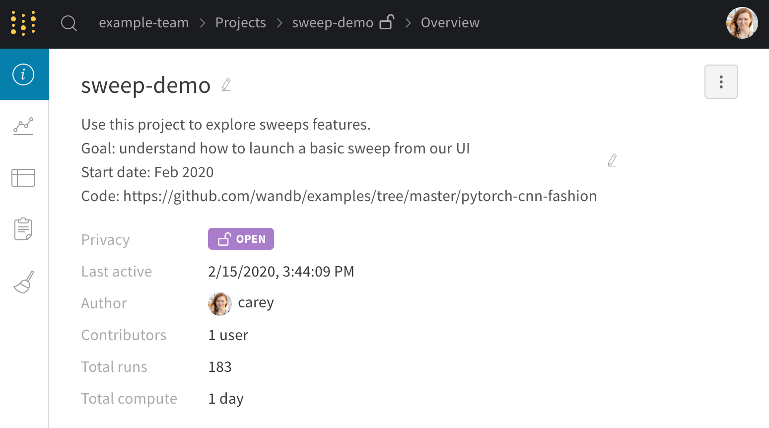 프로젝트 워크스페이스는 여러분의 개인적인 실험 비교를 위한 모래상자를 제공합니다. 프로젝트를 사용하여 비교할 수 있는 모델들을 조직화하세요. 같은 문제를 다른 아키텍처, 하이퍼파라미터, 데이터셋, 전처리 등으로 작업합니다.