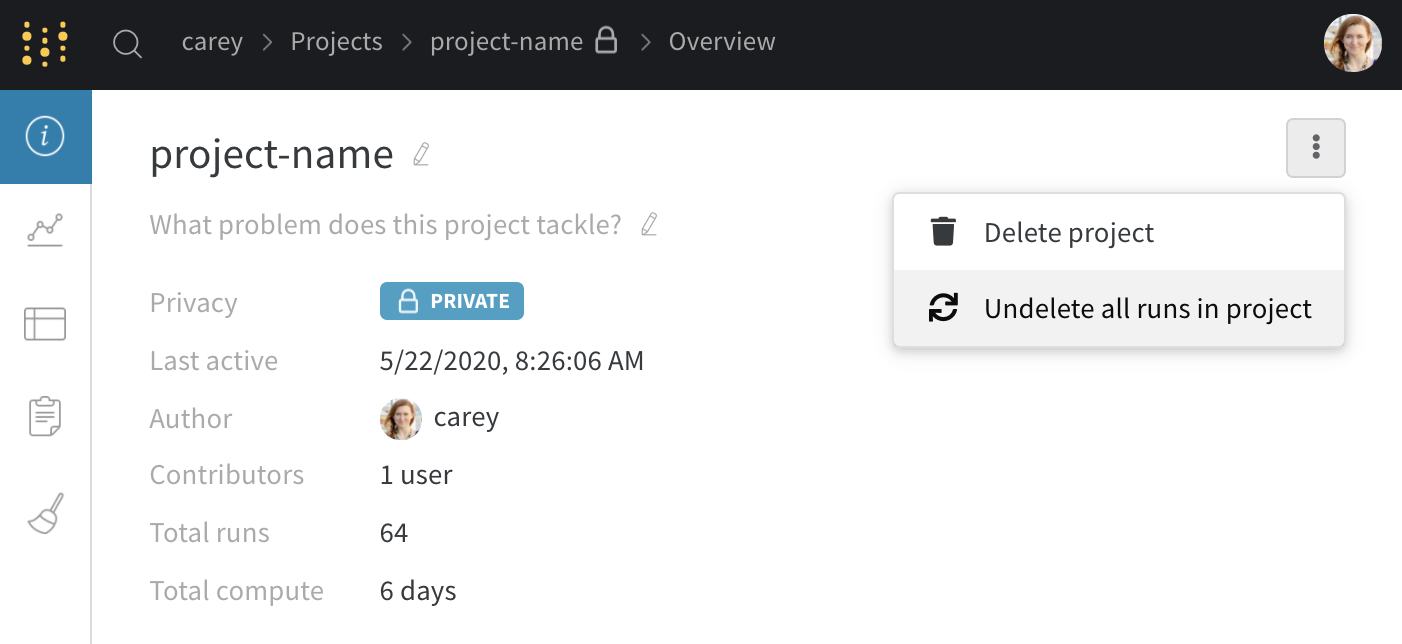 • run 복구: 드롭다운 메뉴를 클릭하고 "모든 run 복구"를 클릭하여 프로젝트에서 삭제된 run을 복구하세요.