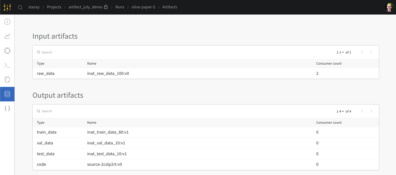 • 이 run의 입력 및 출력 Artifacts에 대한 검색 가능한 목록 제공