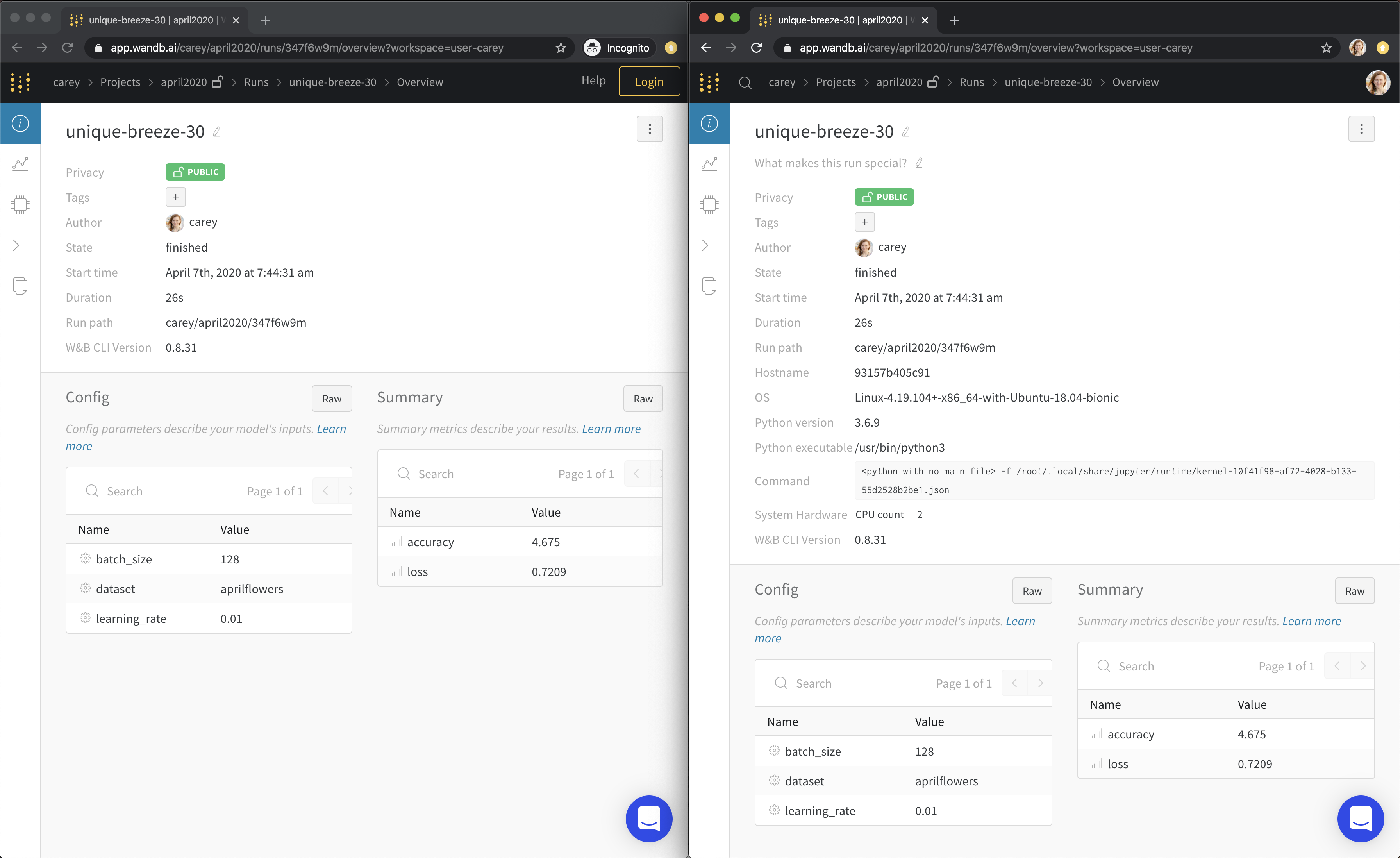Python 세부 정보는 페이지 자체를 공개하더라도 비공개입니다. 여기 제 run 페이지의 익명 상태와 제 계정의 오른쪽 예입니다.