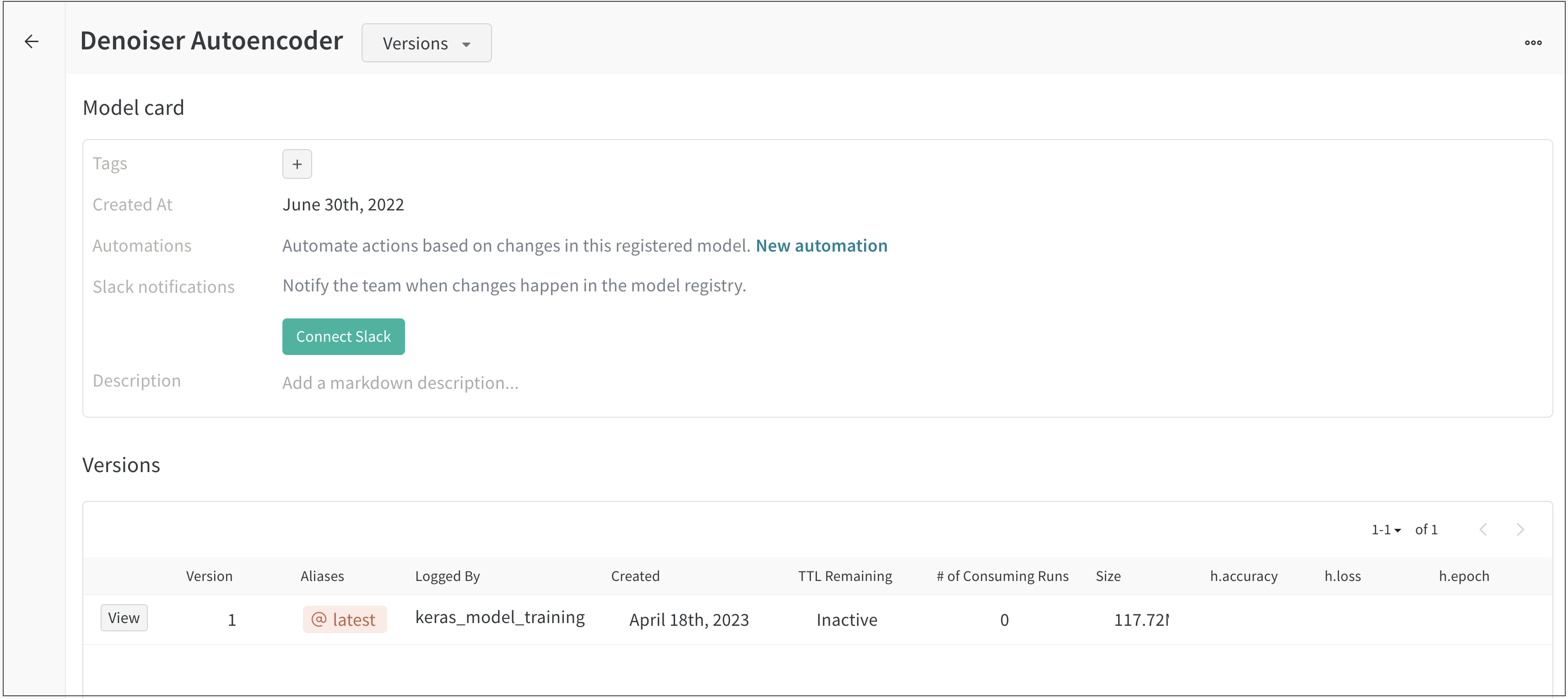 팀을 위한 Slack 알림이 구성되어 있으면, Connect Slack 버튼 대신 New model version linked to...라고 표시되는 토글이 나타납니다.