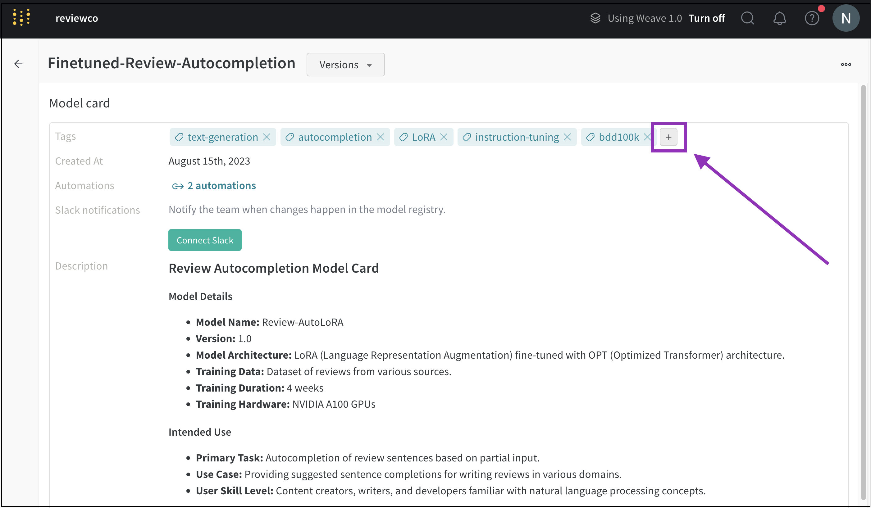 모델 태그를 추가하려는 등록된 모델 이름 옆에 있는 상세 보기를 선택합니다.